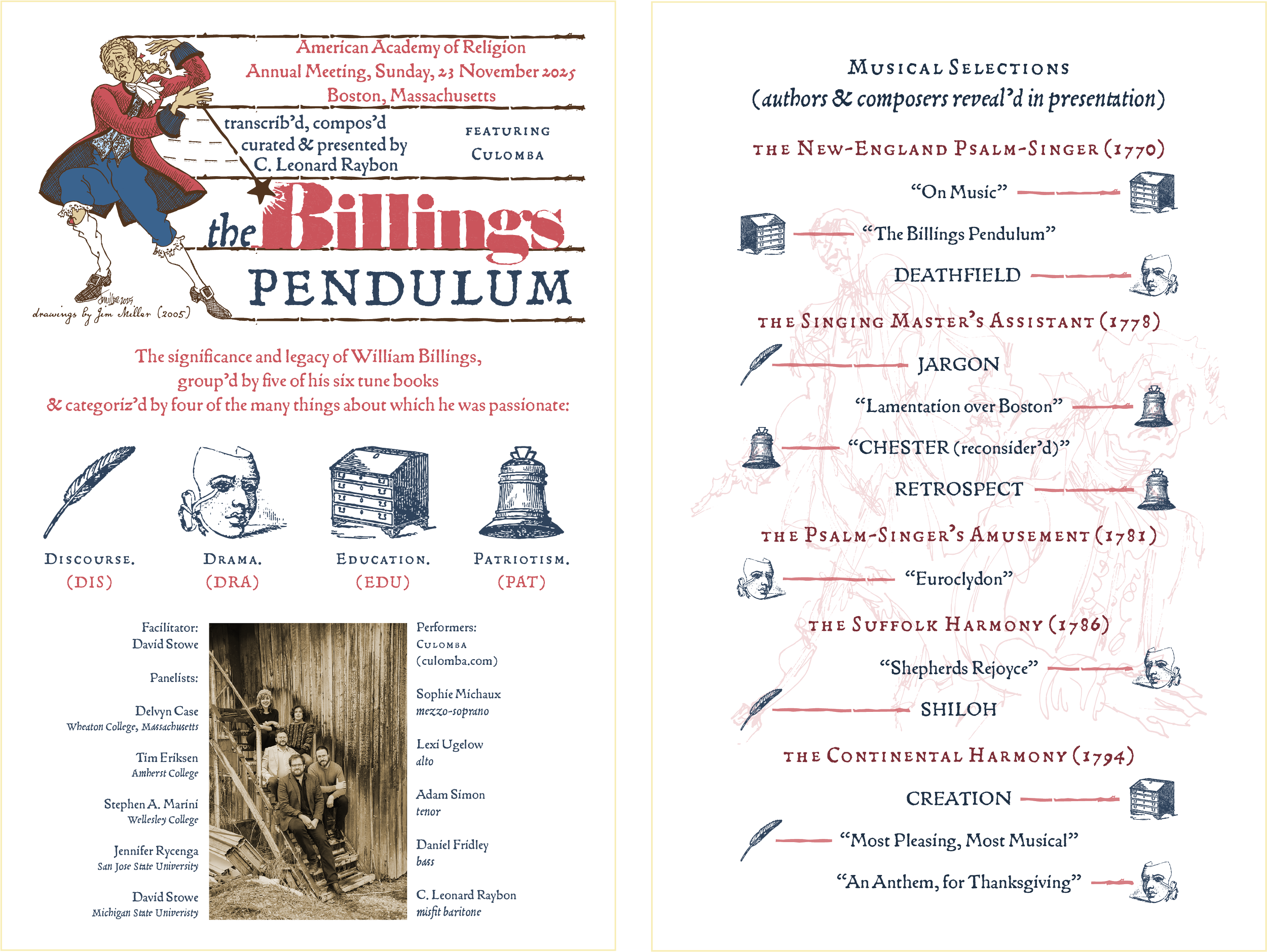 This session explores the significance and legacy of pioneering American composer of sacred music, William Billings, who died 225 years ago this year. Billings tanned leather, taught singing schools, fathered a large family, and composed sacred music in Boston during the American Revolution. A staunch Whig, his music was associated with the cause of American freedom. The centerpiece of the roundtable will be a musical program comprising original compositions and transcriptions newly curated, entitled The Billings Pendulum. Panelists will offer brief comments on the musical program and Billings's religiosity, politics, and lasting significance.